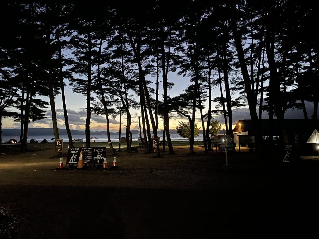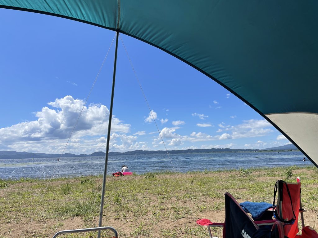 インター近いし、湖はキラキラだし、湖のすぐそばにタープ張れるし、