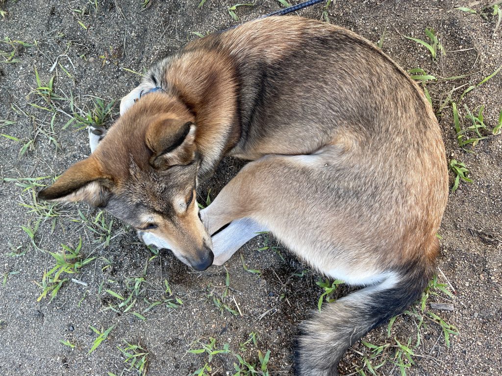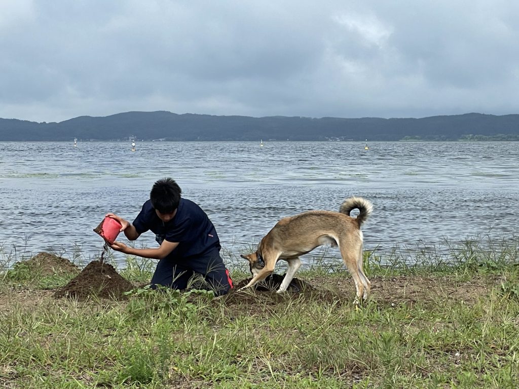 まめ、普段の散歩中にも、ちょっと柔らかい土があると一生懸命掘りたがるのですが、キャンプ先の砂浜はまめには非常に魅力的だったらしくて、せっせせっせと穴を掘っていました。