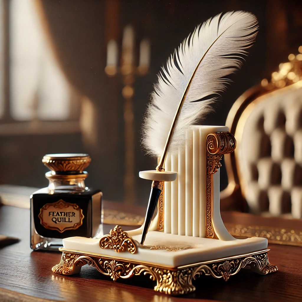 机の端には象牙で装飾された細身のペンスタンドがあり、羽ペンが静かに立てられている。金細工の台座が優雅に輝き、品格を添える。